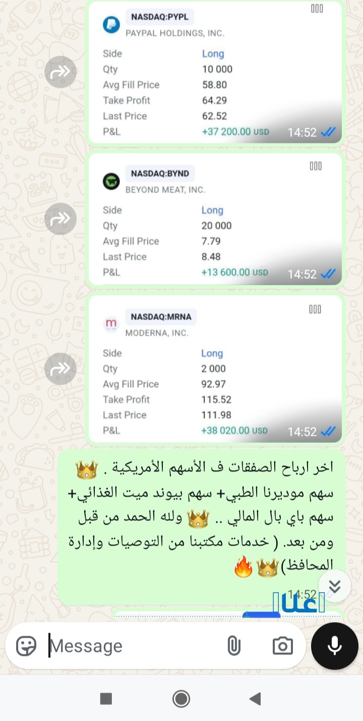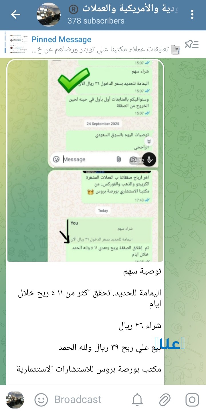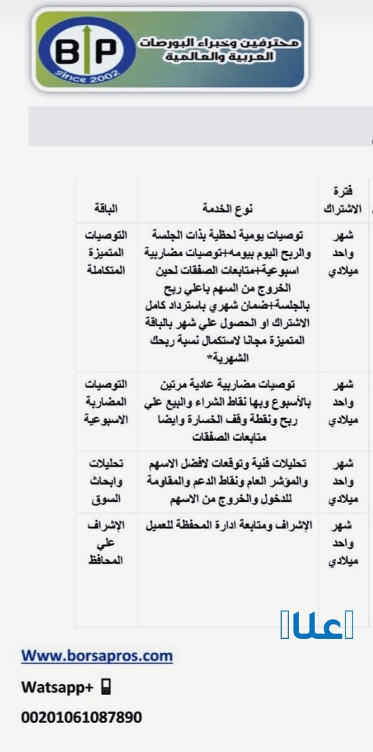 خدمات التوصيات الذهبية وإدارة المحافظ باعلي ربح يومي واسبوعي لمحفظتك من مكتبنا الاستشاري العالمي بالقاهرة بورصة بروس .. ونتاءجنا وارباحنا معلنه ومصورة اول باول علي تويتر وتليجرام